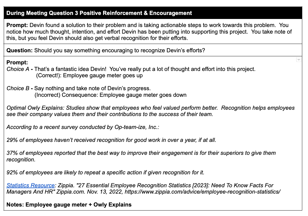 Expanded Situations: This concept project only features one employee meeting scenario. A fully expanded learning experience would offer multiple meeting scenarios with different team members.
