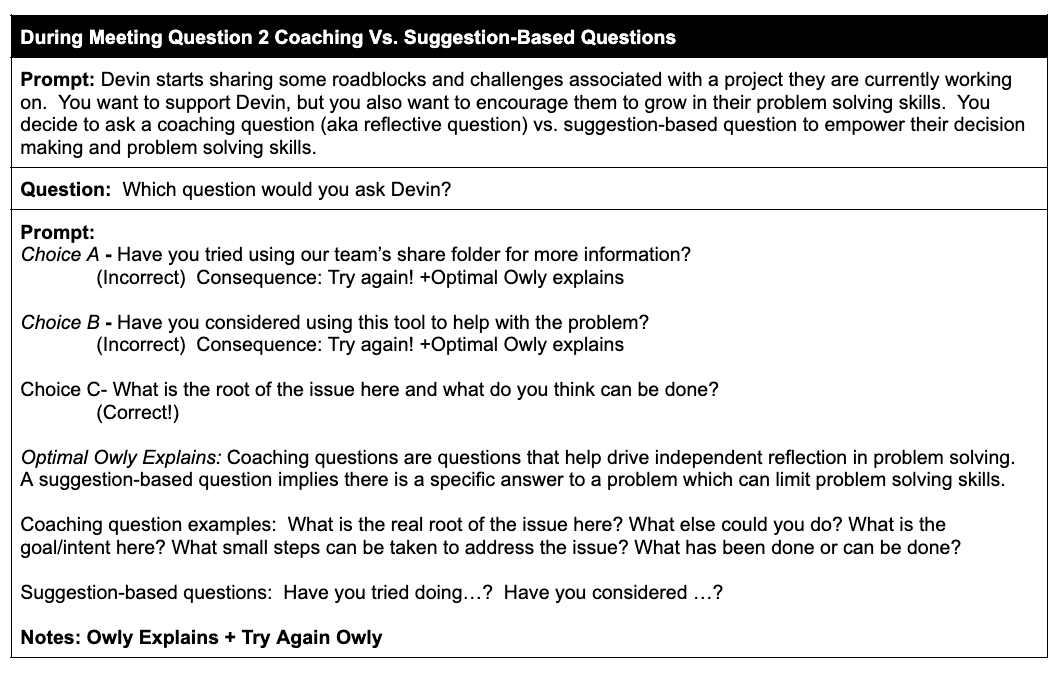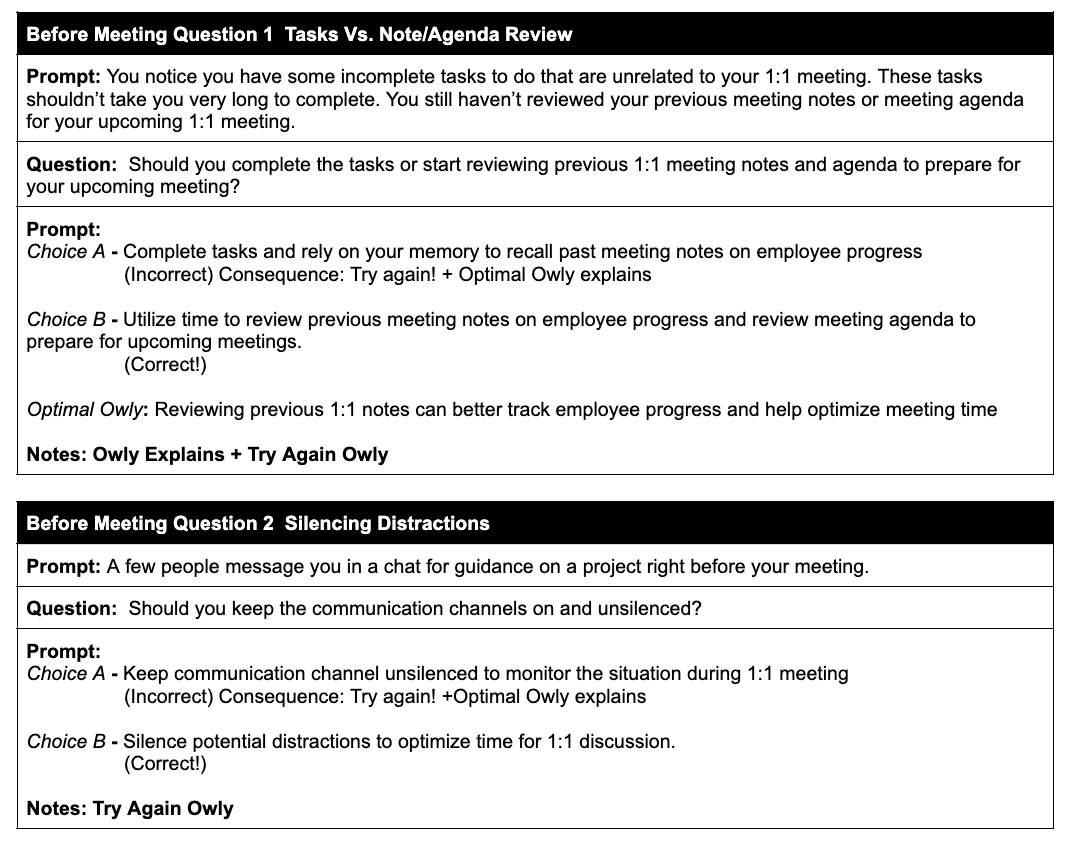 I consulted with the SME to ensure each scenario was grounded in reality. We prioritized mirroring realistic experiences during a remote 1:1 meeting scenario to help create authentic consequences which provided the “why” for decision making.