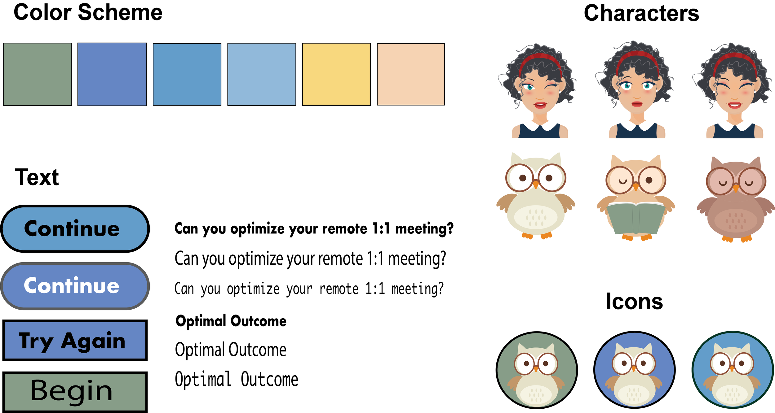 Mentor: The learner can access a mentor named “Optimal Owly” to assist them in optimizing their 1:1 meeting. Optimal Owly provides suggestions and guidance to the user when support is needed to make decisions during the remote 1:1 meeting scenario. I created a custom icon for the learner to access the mentor throughout the learning experience.
