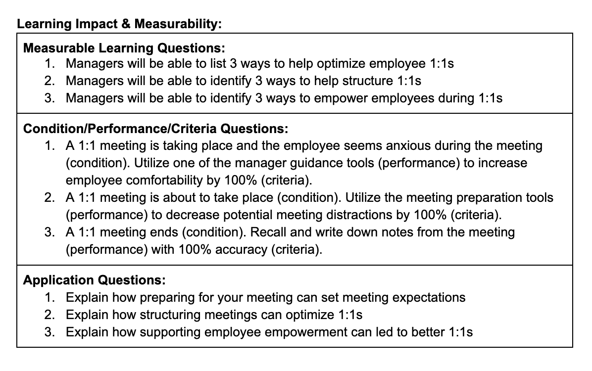 After careful analysis, I determined that the problem was performance related and caused by a lack of knowledge in managers effectively running remote team 1:1 meetings. I recommended a scenario-based eLearning experience that allows managers to practice making decisions during their remote 1:1 meeting in a risk free environment. Showing managers the realistic, memorable consequences of common meeting mistakes allows the learner to practice avoiding these mistakes and apply effective strategies to better optimize meetings in real life.