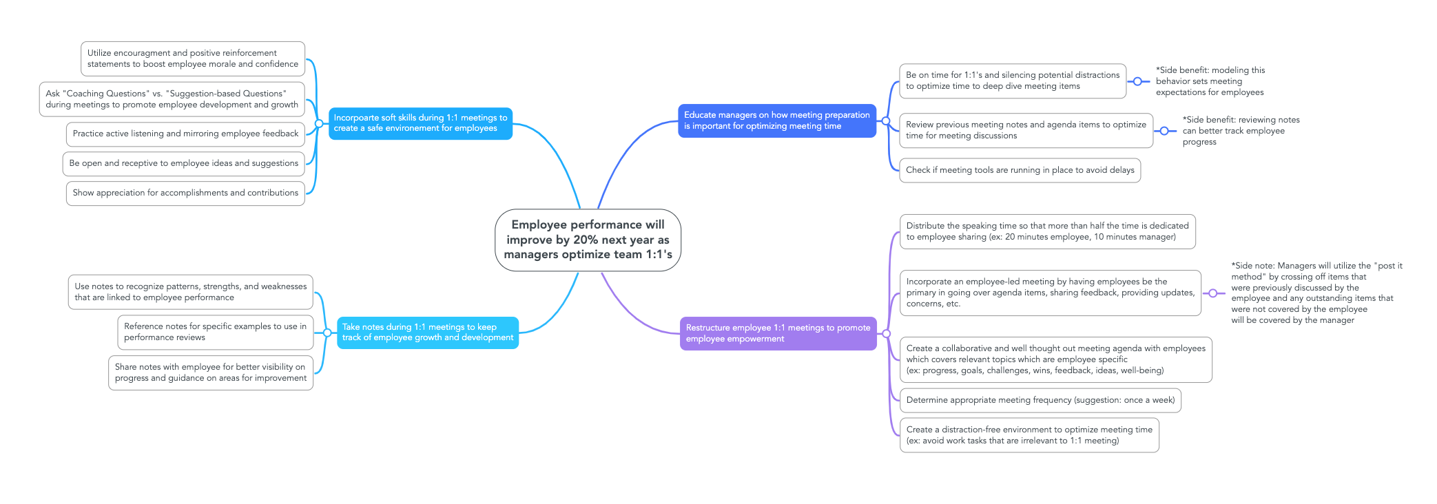 Op-team-ize, Inc. (a fictitious company for this concept project) conducted an employee survey and found that employees who don’t engage in regular remote 1:1s with their managers felt unappreciated and lacked confidence in their work tasks. Employees that did have remote 1:1s with their managers felt communication blockers due to power dynamics and were selective with sharing feedback, updates, and ideas. Understanding the impact team 1:1s have on employee performance, the company decided to prioritize manager training to better optimize their team 1:1 meetings.