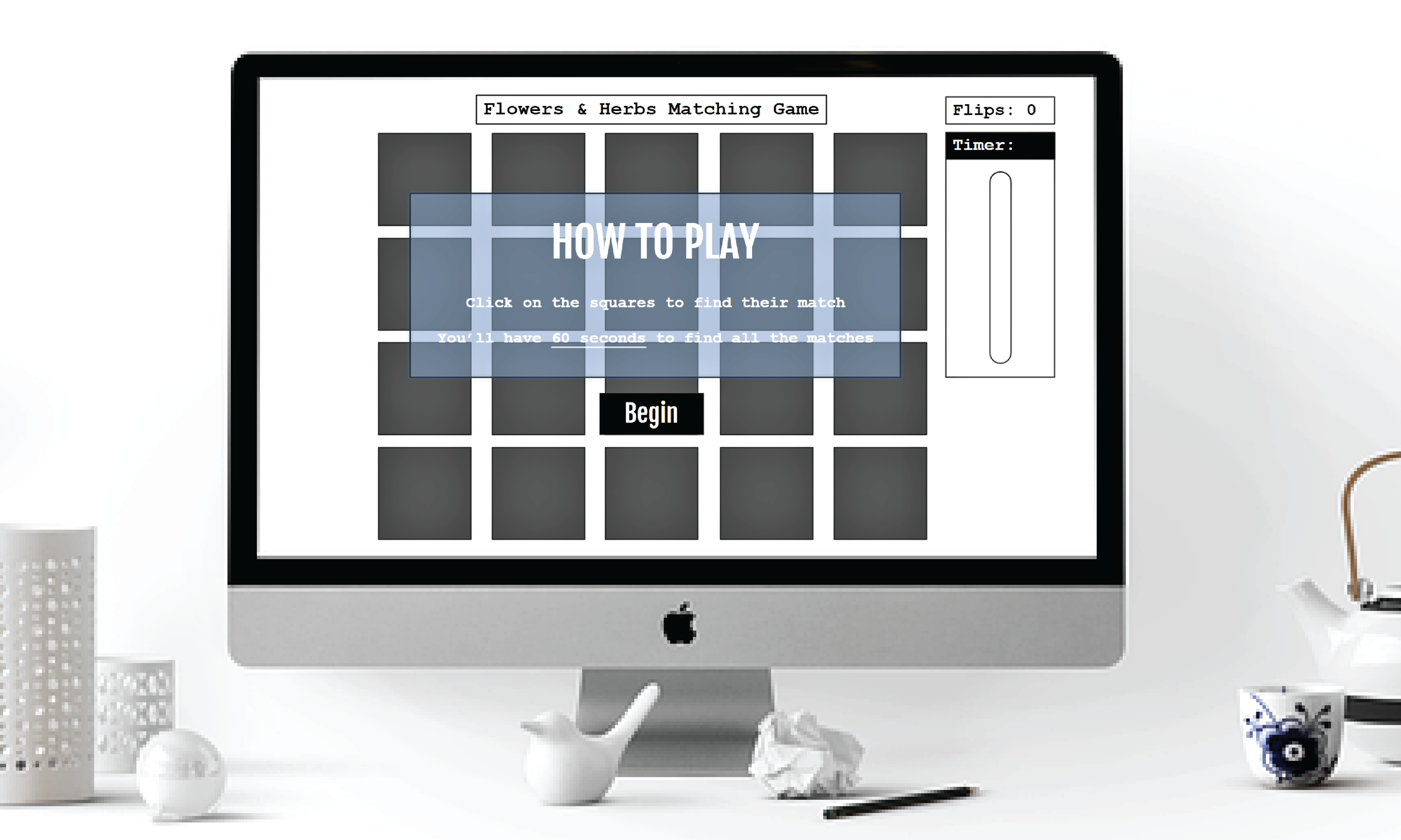 Flower & Herbs Matching Game: The matching game provides a visual introduction to various flower and herb names and imagery. The learner has 60 seconds to find ten sets of herbs and flowers. During the game, the user can also monitor how many flips are used to find the sets. This learning experience uses a combination of several variables, states, triggers, and layers.